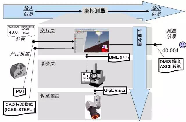 首先通(tōng)過以太網圖像傳輸接口聯接視(shì)像傳感器(qì)與坐(zuò)标測量機, 并通(tōng)過軟件接口DME I++ 與上(shàng)層級交互作(zuò)用,繼而實現測量系統交互層軟件與用戶的人(rén)機對話(huà),與此同時(shí),通(tōng)過信息技(jì)術(shù)連接輸入數(shù)據特性信息,例如攜帶産品特性信息的産品制(zhì)造信息PMI與産品外形數(shù)據(例如多(duō)種格式的CAD标準格式)、連接輸出測量結果信息(例如标準的DMIS輸出或其它的基于ASCII的格式)。